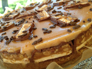 - Corte os snickers em fatias e faça todo o contorno da forma (ver foto).